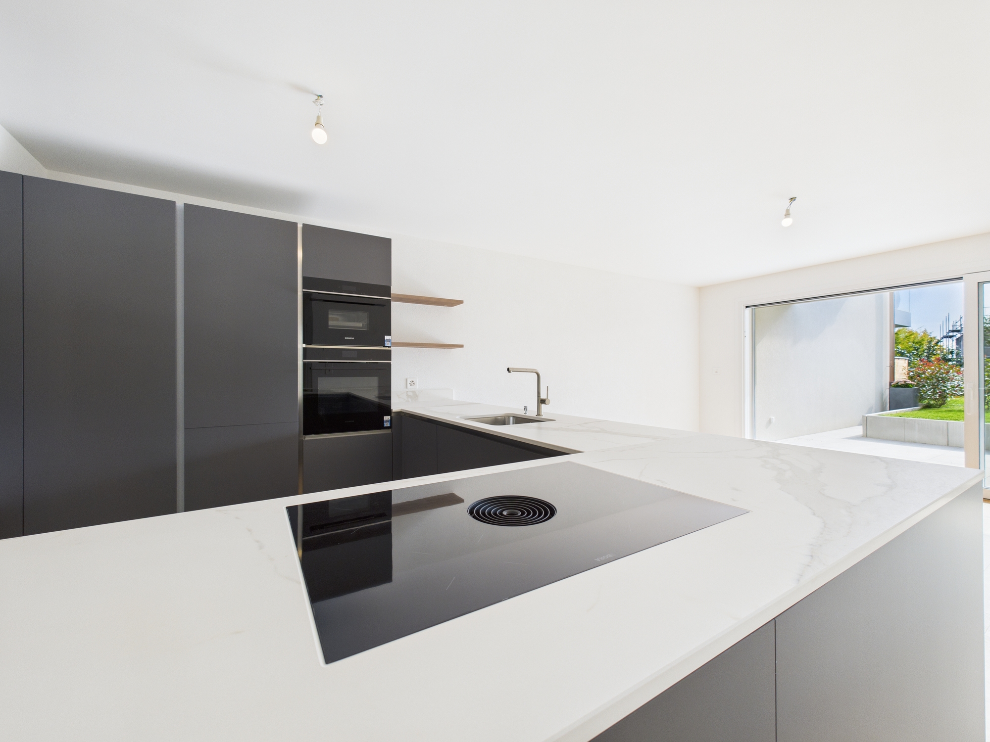 La cuisine haut de gamme, ouverte sur le séjour et entièrement équipée, dispose d’un plan de travail en céramique, de plaques de cuissons à induction avec hotte intégrée, d’un lave-vaisselle, d’un réfrigérateur avec congélateur, d’un four traditionnel, d’un four à vapeur et de nombreux espaces de rangements.